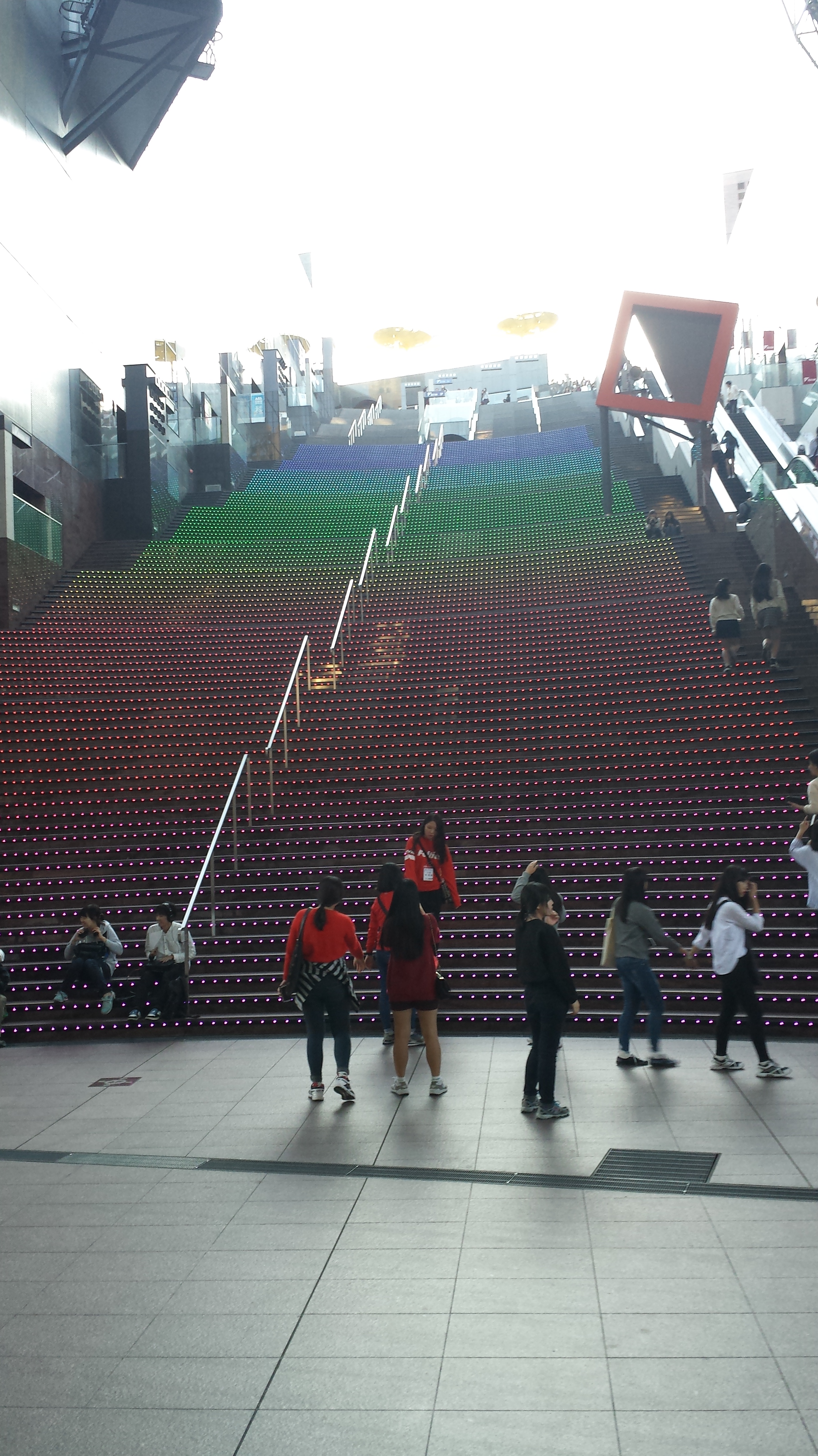 eine wunderschöne Treppe zu fotografieren. Die Stufen nahmen abwechselnd unterschiedliche Farben an und gingen ineinander über.Ganz oben hatte man auch einen wunderbaren Blick auf die Stadt. Leider durch das Glas nicht so leicht zu fotografieren.