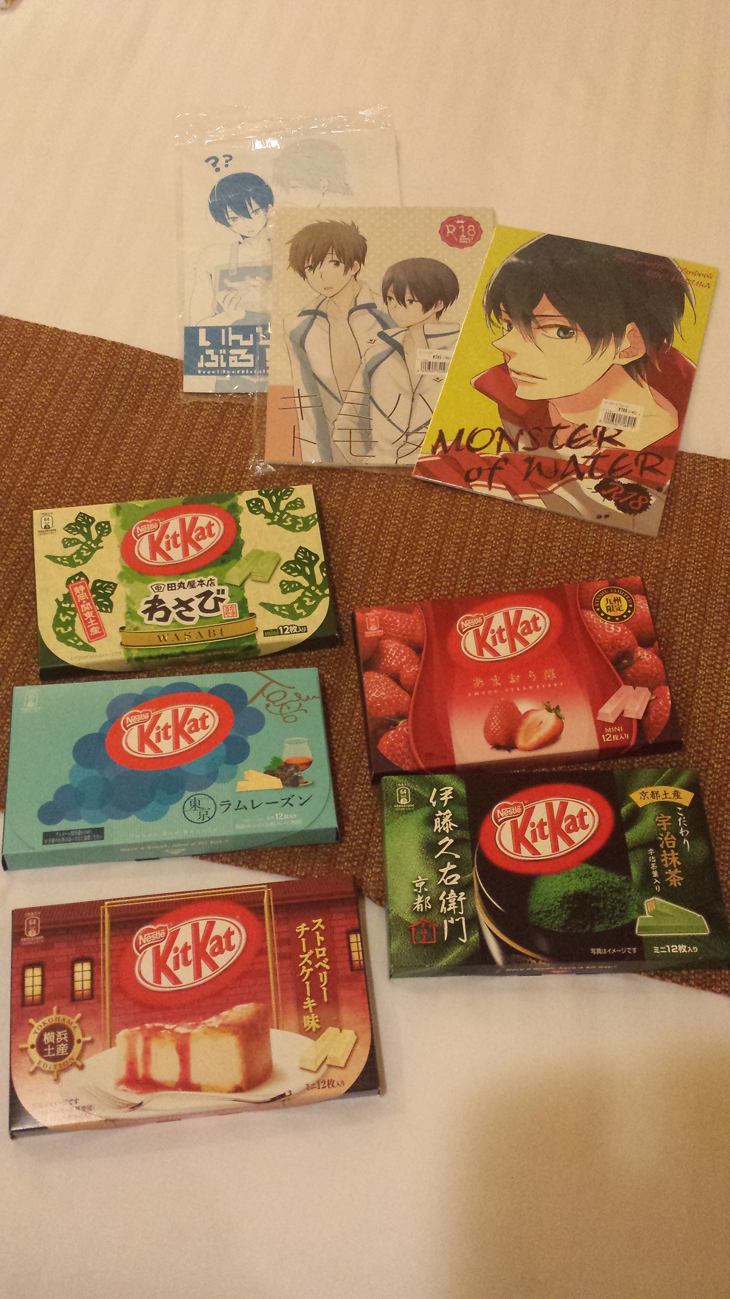 Wir waren noch in einem Geschäft, wo wir auf Free! Dojinshis gestoßen sind. Auch hier habe ich mir direkt mal drei gekauft (wenn man schon mal da ist…). Schade, dass es sowas nicht in Deutschland gibt. Natürlich sind sie auf japanisch, aber Bilder sagen mehr als tausend Worte 😉 Zudem habe ich mir noch ein paar Sorten KitKat gekauft – zum probieren!