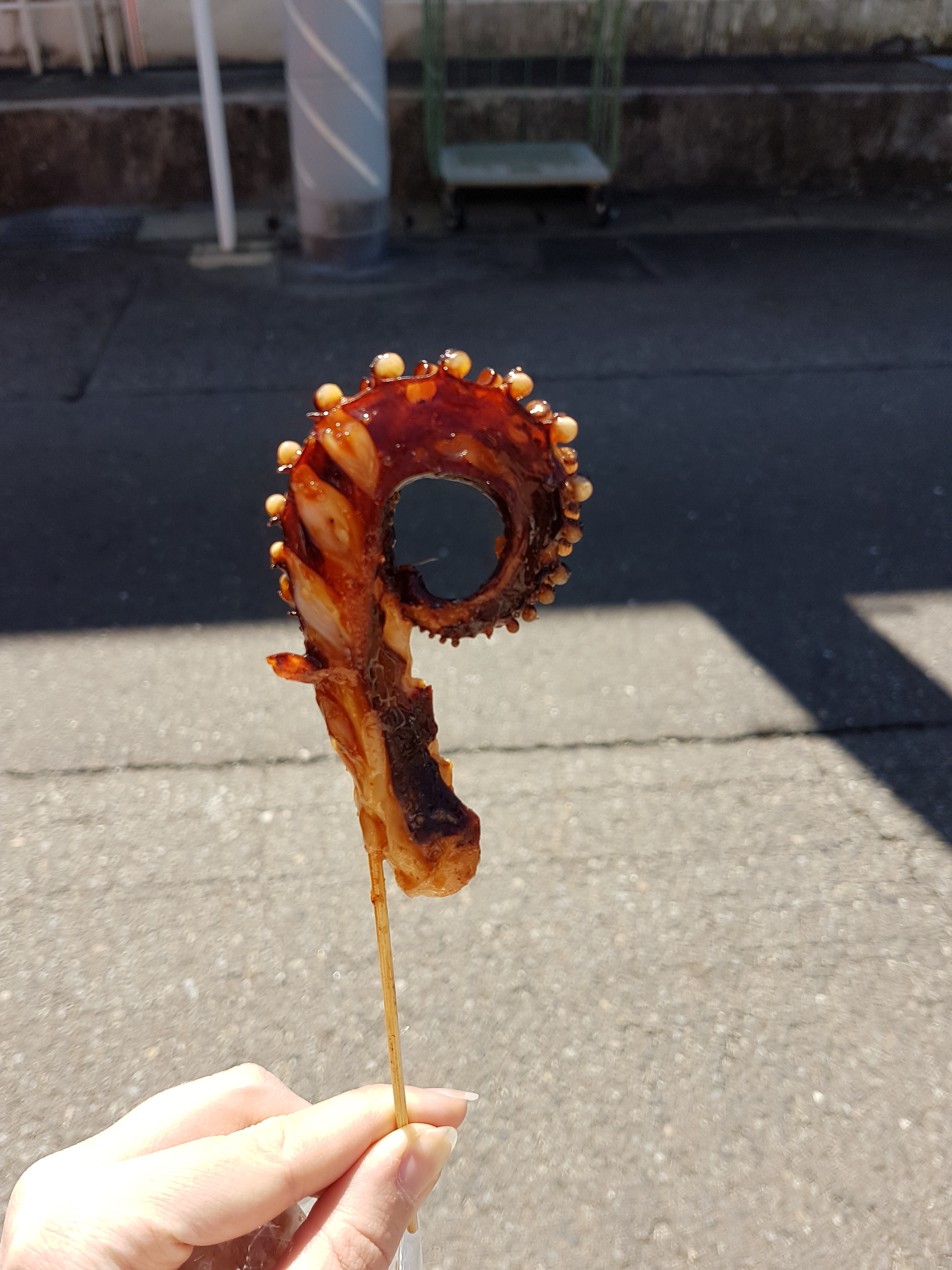 Neben diesen überaus leckeren Happen, gab es auch allerlei andere Köstlichkeiten – wie zum Beispiel diesen Tintenfischarm. Ich habe ich einfach mal gewagt, doch leider schien der nicht ganz durch gewesen zu sein. Innendrin war eine Sehne, die ich einfach nicht zerkauen konnte. Durch Beobachtung Anderer konnten wir aber feststellen, dass diese Sehne durchaus mitgegessen wird. Schade, denn es schmeckte an sich echt gut.