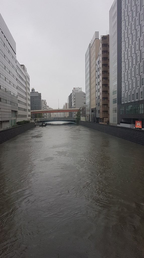 Aufgrund des Taifuns regnet es heute durchgehend. Teilweise sind starke Windböen dabei und der Regen wird schlimmer. Heute Nacht gab es Lautsprecherdurchsagen, wo vermutlich vor dem Taifun gewarnt wurde. Züge fahren nur eingeschränkt, alle Geschäfte sind geschlossen und fast alle Restaurants haben zu. Dennoch waren wir kurz draußen, da wir uns ja irgendwie mit Essen versorgen mussten.