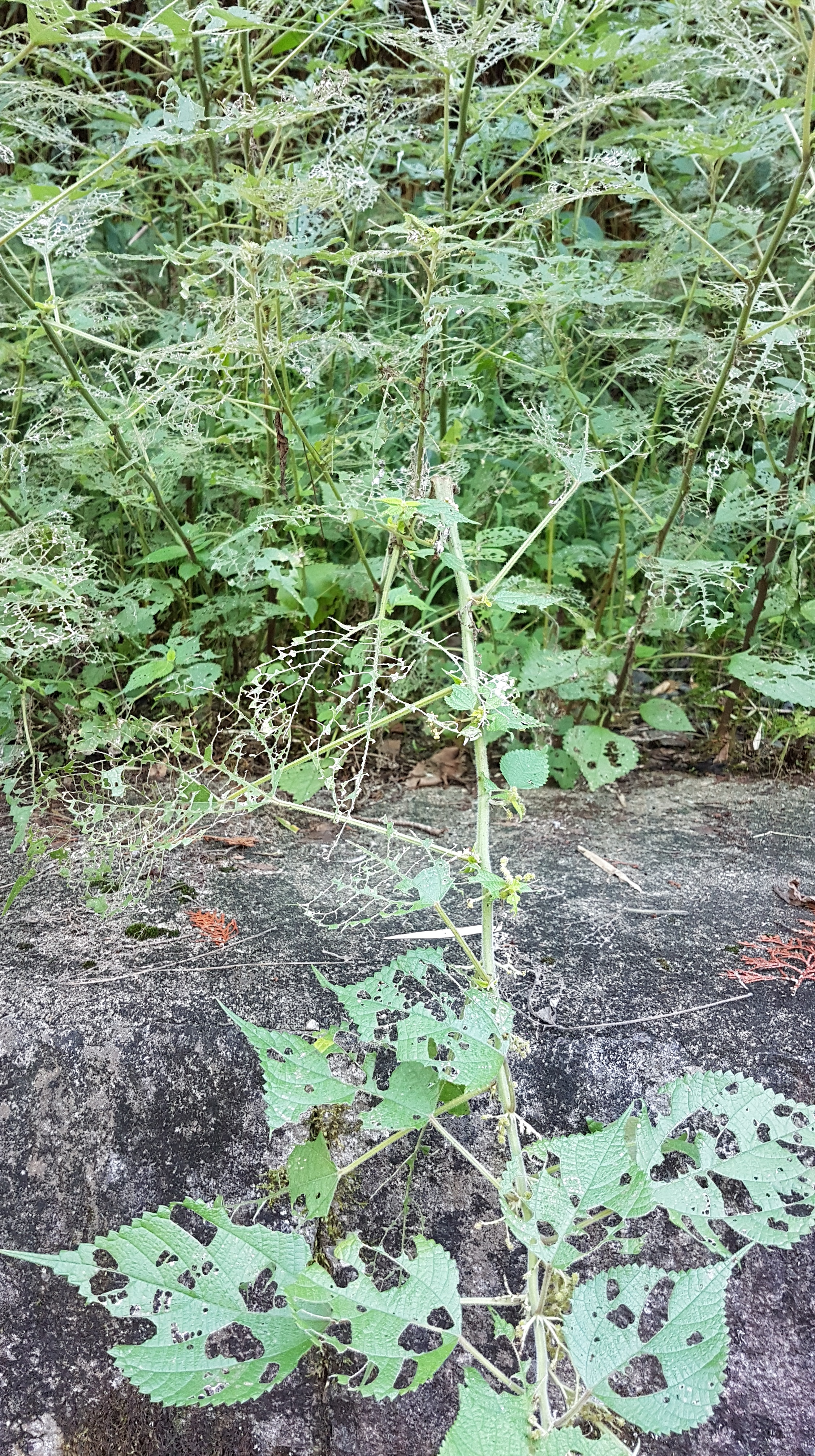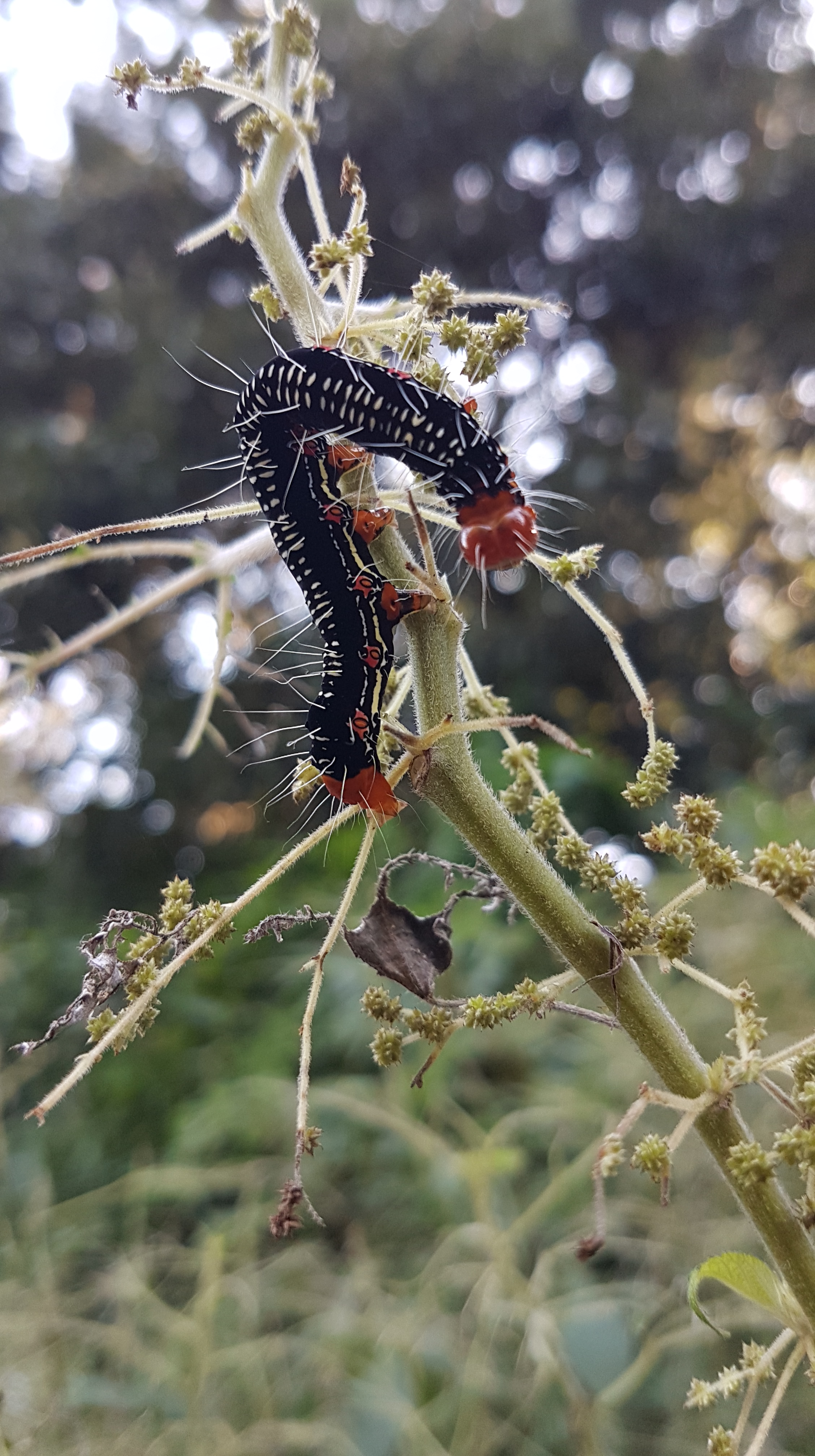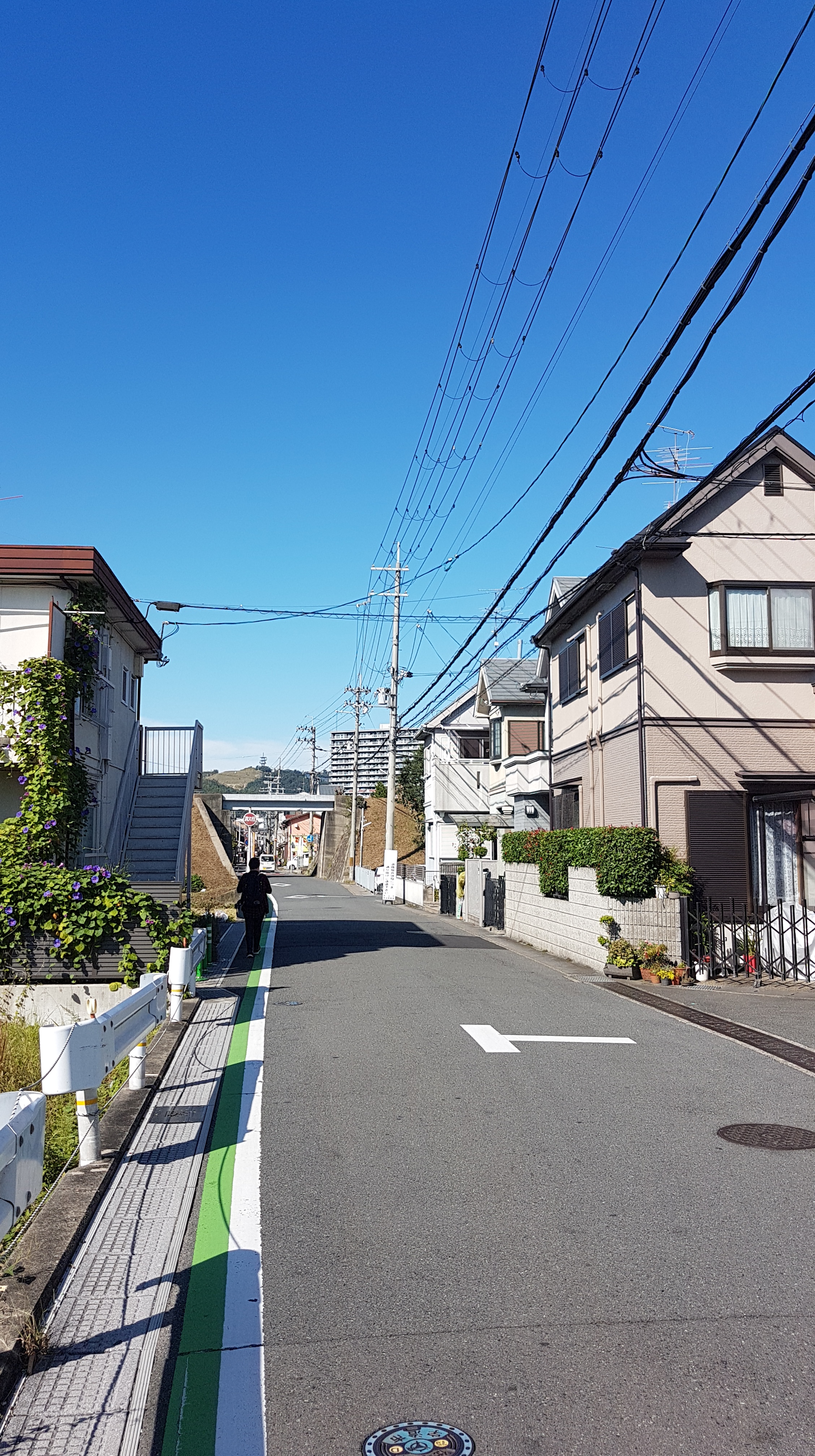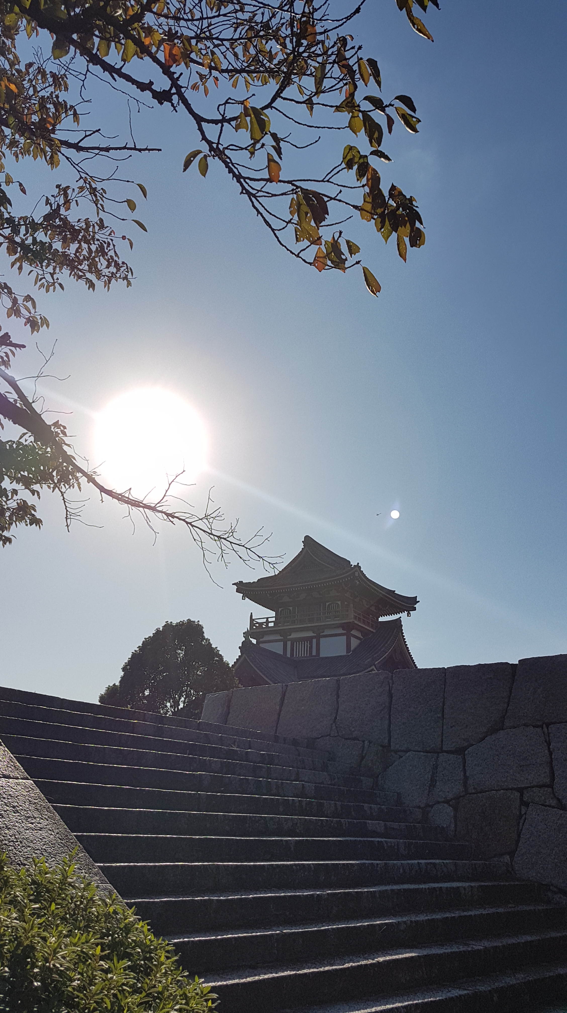 Auf Google Maps hatte ich eine Burg in der Nähe entdeckt, die wir als nächstes spontan besichtigen wollten. Der Weg führte über eine leichte Steigung, die rechts und links von Bäumen umgeben war. Teilweise kam es mir so vor wie in Sapporo, denn dort sind wir eine ähnliche Straße entlanggelaufen. Es gab dort interessante Raupen, die die Blätter von den Pflanzen verspeist haben.